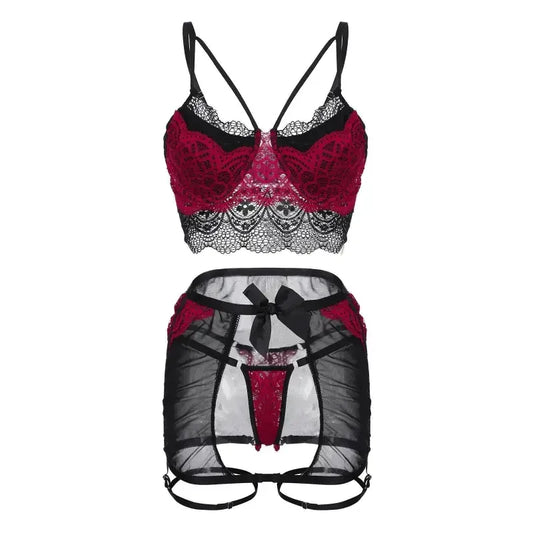 Floral Lace Bra Garter Mesh Skirt 3 Pcs